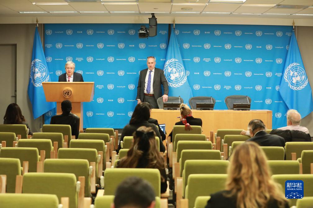 12月22日,在位于纽约的联合国总部,联合国秘书长古特雷斯(后左)在记者见面会上讲话。