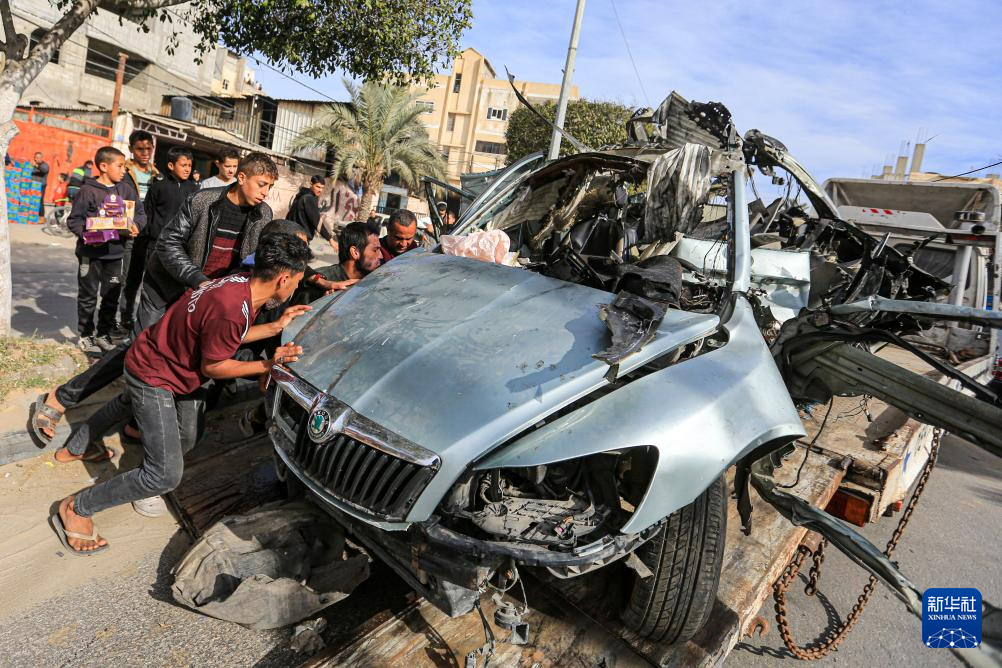 这是1月21日在加沙地带南部城市拉法拍摄的遭以军空袭后的车辆。