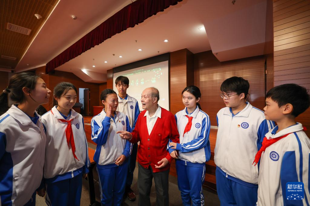 2月26日,在天津市第四中学,91岁的新中国第一代飞行员周修平在课后与学生们交流。