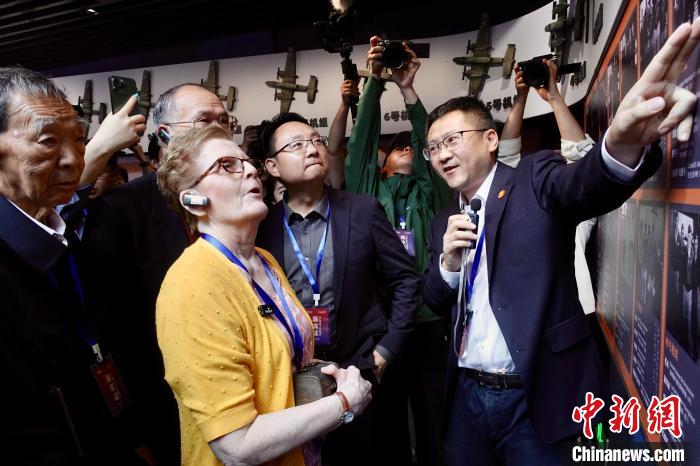 美国飞行员查尔斯·奥祖克的女儿苏珊·奥祖克(身着黄色衣服的女士)观看杜立特行动衢州大救援主题展览。钱晨菲 摄