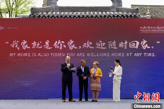 廖明发(左二)向苏珊·奥祖克(左三)赠送老宅钥匙,寓意“常回家看看”。当年,苏珊·奥祖克的父亲查尔斯·奥祖克跳伞降落在衢州江山后,被廖明发的父亲廖诗原发现并带回家中照料。董易鑫摄
