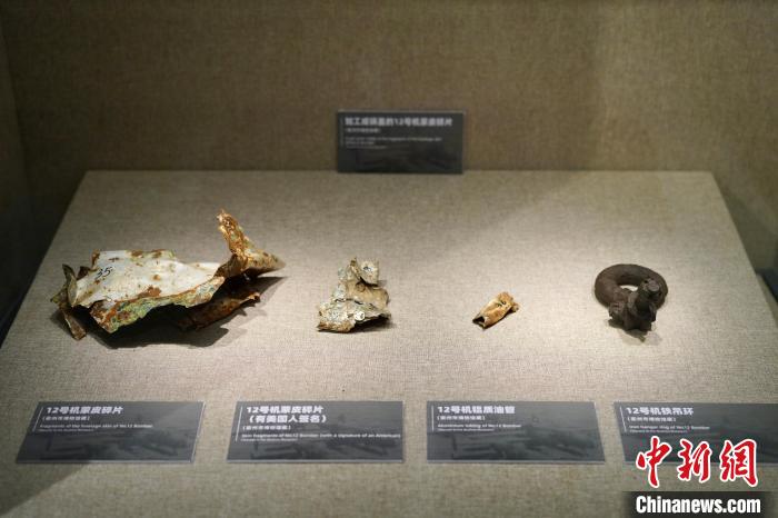 4月18日,杜立特行动纪念馆内展出的当年美军飞行员使用的飞行装具及轰炸机零件等文物史料。董易鑫 摄