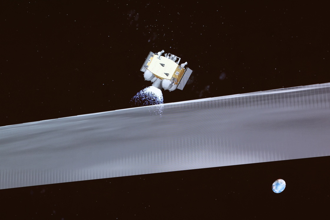 6月4日在北京航天飞行控制中心屏幕上拍摄的嫦娥六号上升器携带月球样品自月球背面起飞的动画模拟画面。