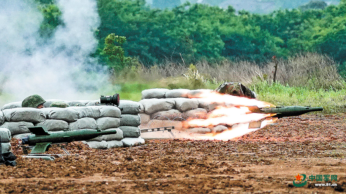 另一阵地,反坦克导弹分队发现“敌”装甲目标进入射击范围。随着指挥员一声令下,一枚枚反坦克导弹呼啸而出,直扑“敌”目标。