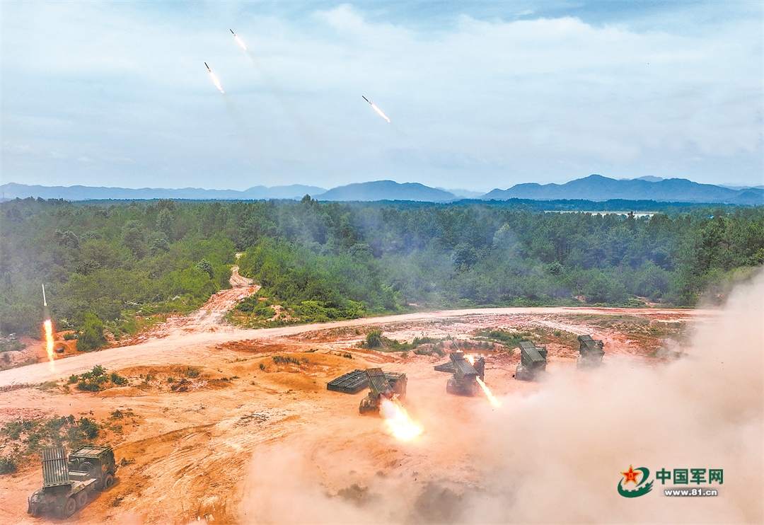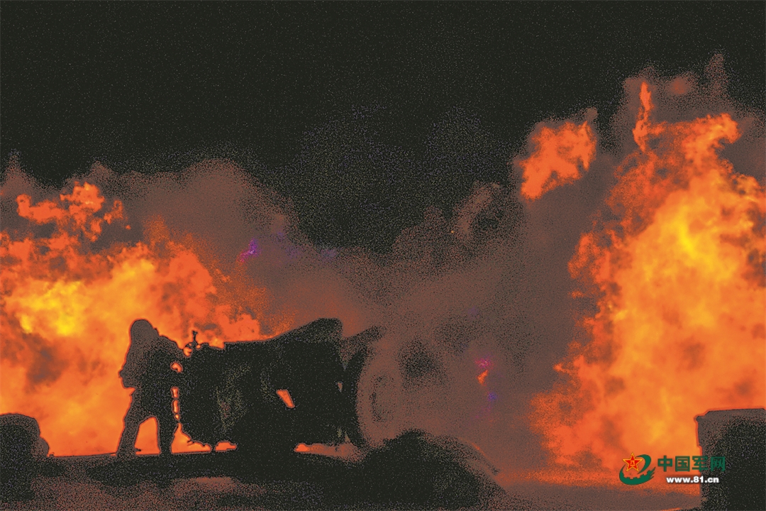 射击阵地上,火箭炮分队接到指挥所命令后,各炮手密切协同,快速完成射击前准备。基准炮单发射击后,指挥所根据侦察分队回传的炸点信息,抓紧调整射击诸元。“放!”火箭弹如“火龙”般呼啸而出。“敌”阵地火光冲天,硝烟弥漫。