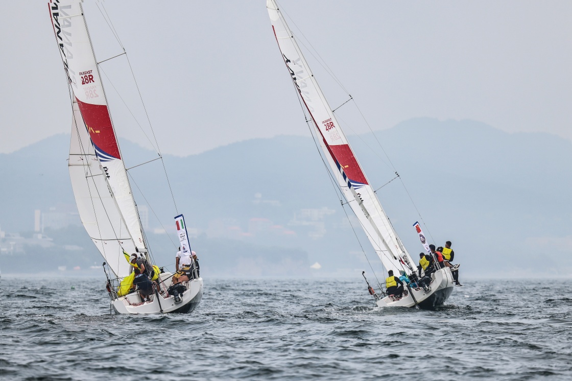 这是7月24日拍摄的参加首届“海军杯”国际帆船邀请赛的中国海军潜艇学院代表队和意大利代表队。新华社发(李昊天 摄)
