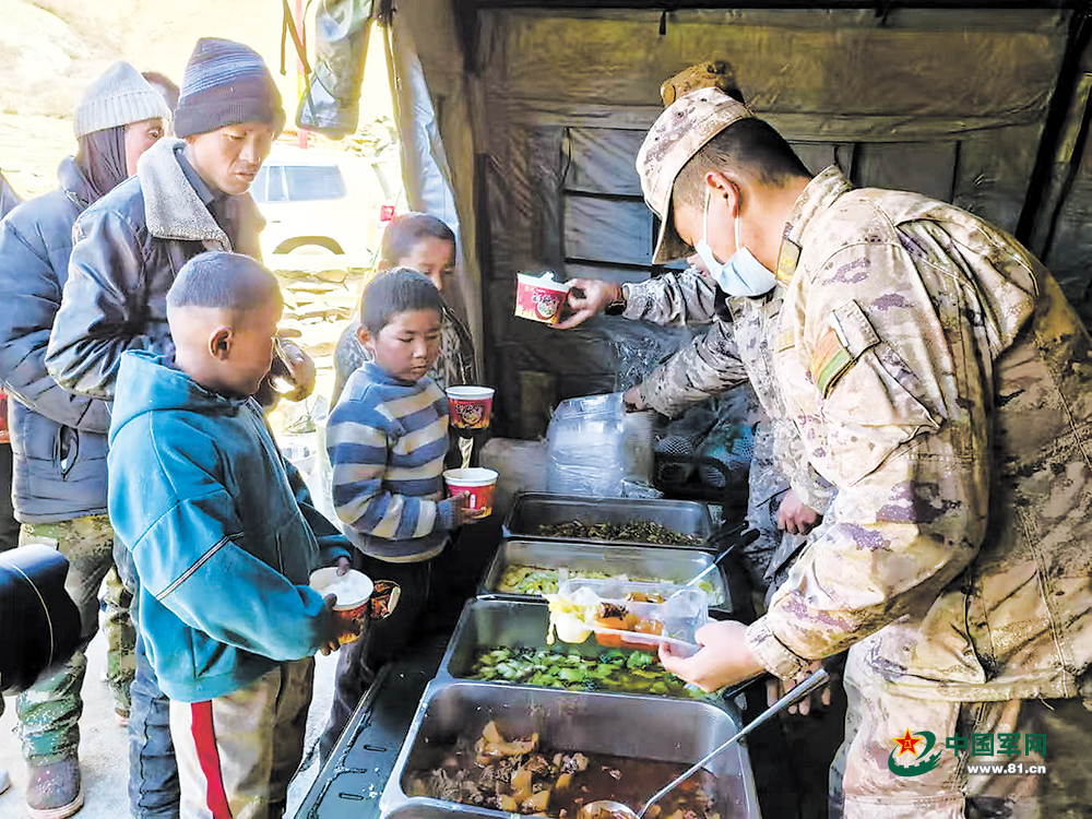 1月8日,西藏军区青藏兵站部官兵在长所乡茶江村开展救援保障工作。图为官兵为受灾群众提供饭菜。普 琼摄