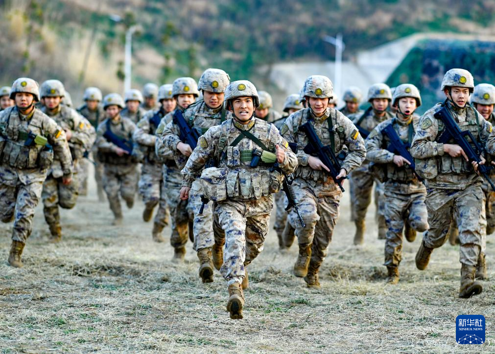火箭军某旅发射营教导员张平坤(中)在五公里越野中带领官兵冲锋(资料照片)。新华社发(刘明松 摄)