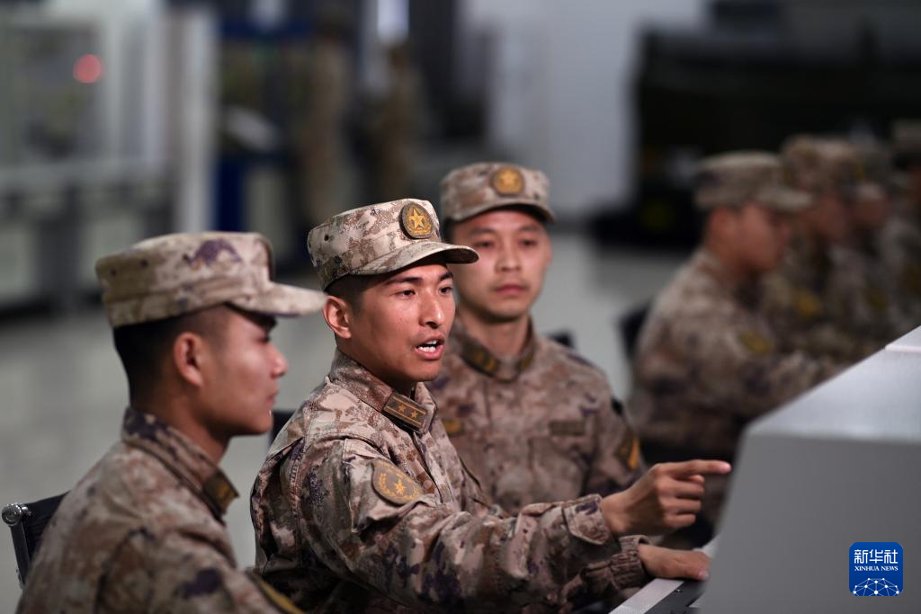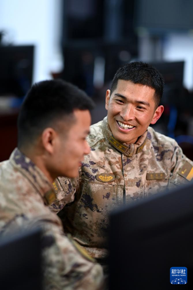火箭军某旅发射营教导员张平坤(左二)与号手交流装备操作技能技巧(资料照片)。新华社发(刘明松 摄)