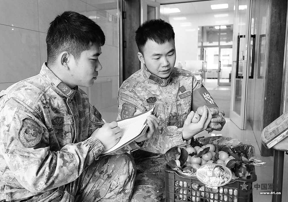 新疆巴音郭楞军分区严格落实伙食管理制度。图为基层风气监督员对采购的菜品进行检查验收。张 迪摄