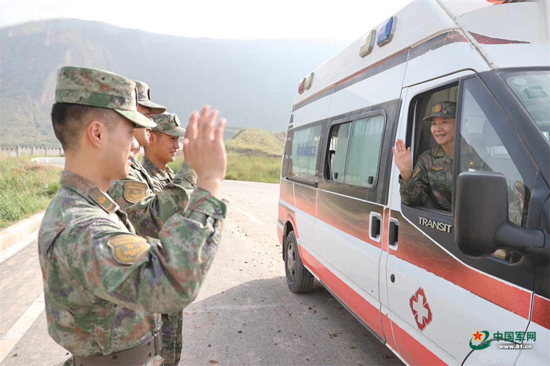 张瑛(右一)巡诊结束与官兵告别。孟钊 摄