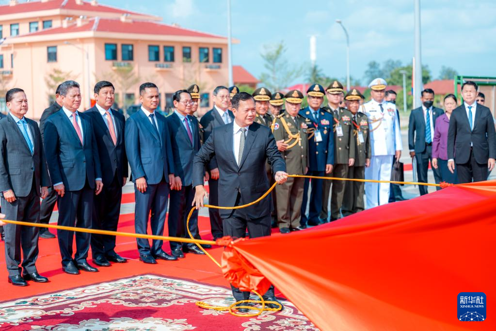 4月5日,柬埔寨首相洪玛奈(前中)出席中柬云壤港联合保障和训练中心挂牌仪式。新华社发(尼多拉摄)