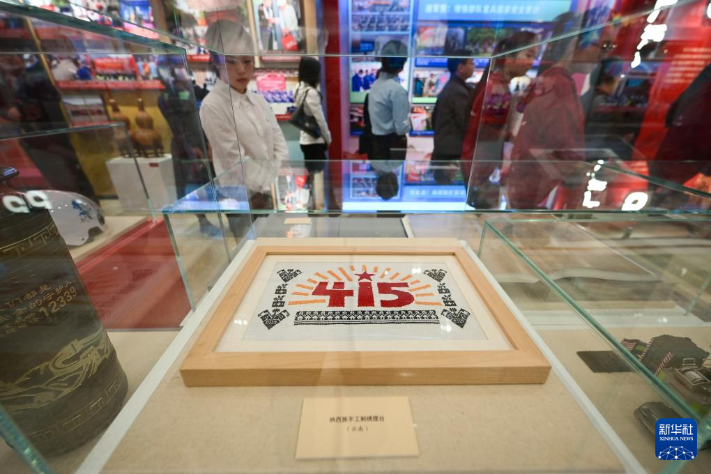 这是展览上展示的纳西族手工刺绣摆台(4月15日摄)。