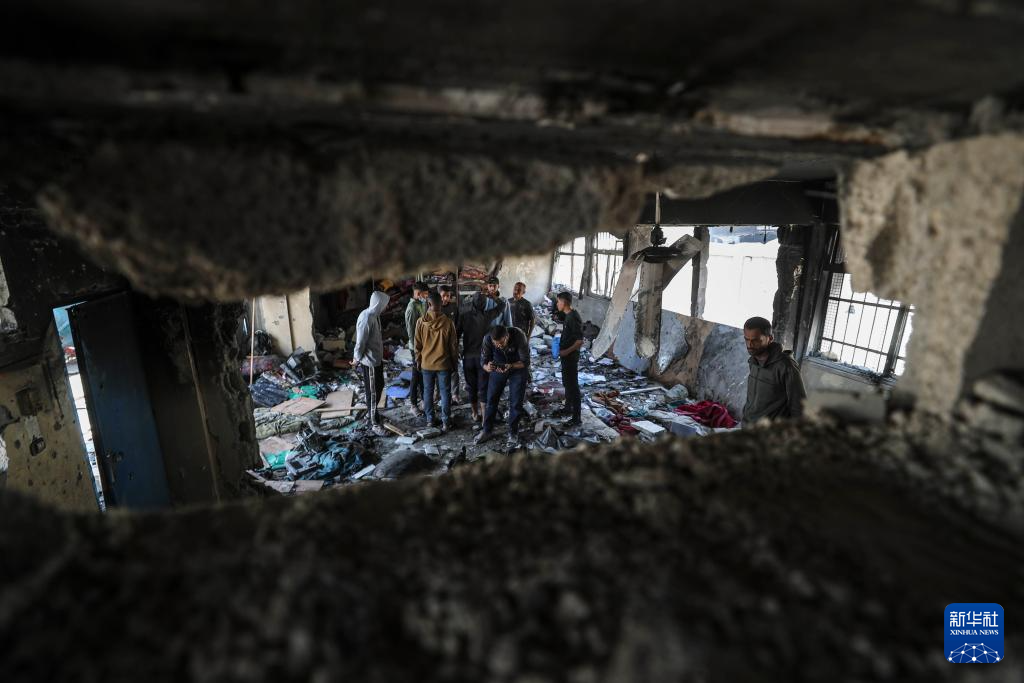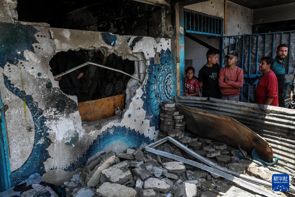 4月17日,在加沙地带北部杰巴利耶难民营,人们查看以军袭击后的废墟。