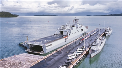据了解,此次长白山舰靠泊,是中柬云壤港联合保障和训练中心挂牌运行后,首次保障中柬联合演习。抵港后,各任务分队与柬方有关部门密切协同,开展卸载作业,并按计划向各自演习地域集结。(周自航郭澍东)