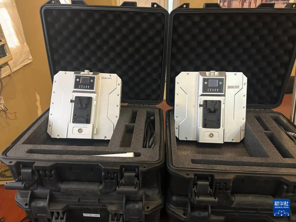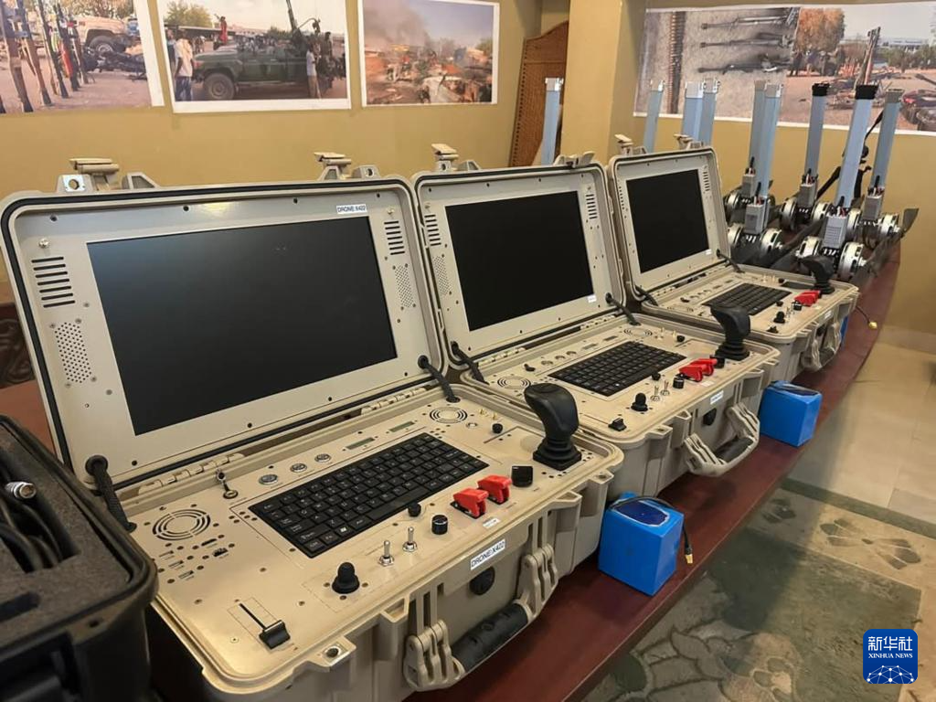 这是5月20日在苏丹首都圈恩图曼市南部萨勒哈地区拍摄的苏丹武装部队缴获的无人机系统组件。
