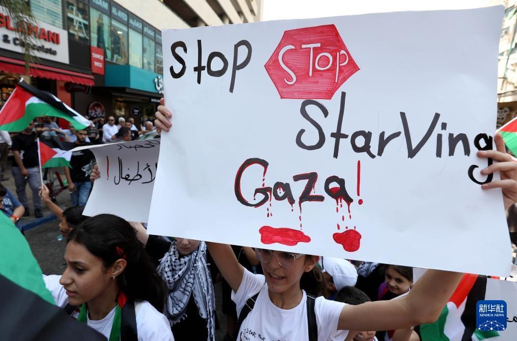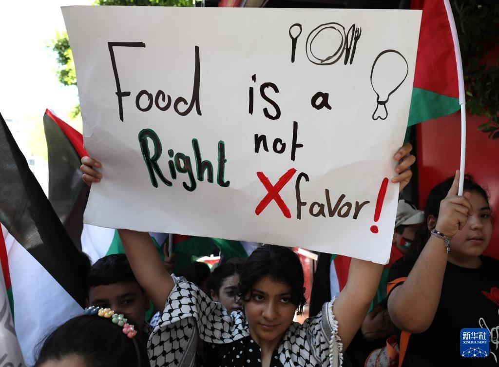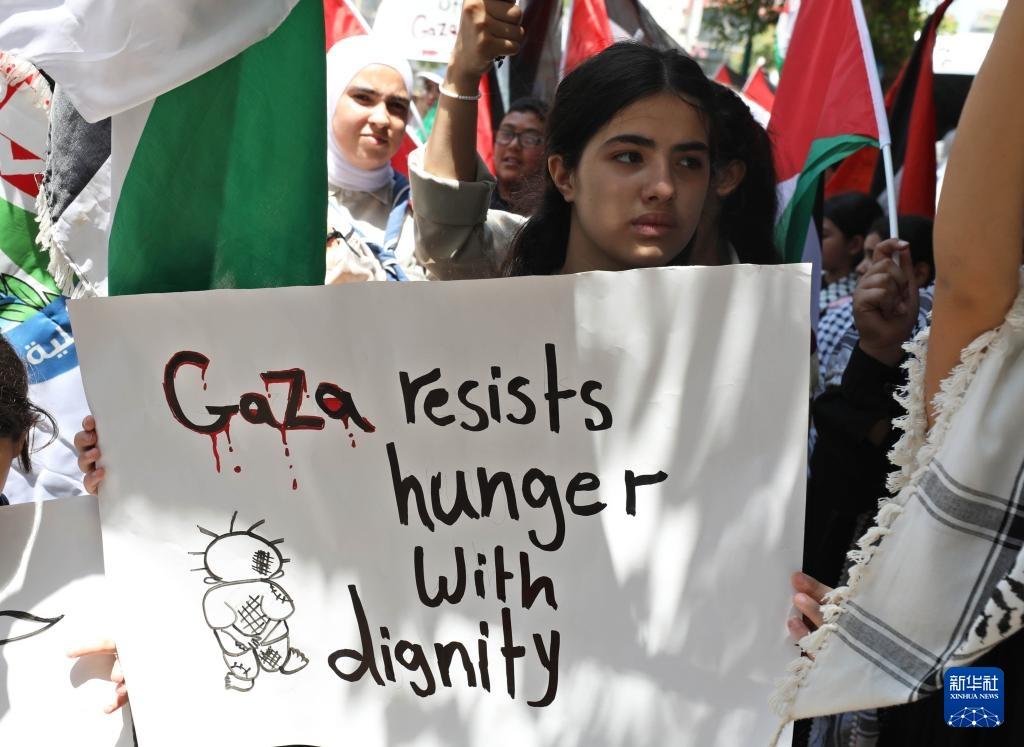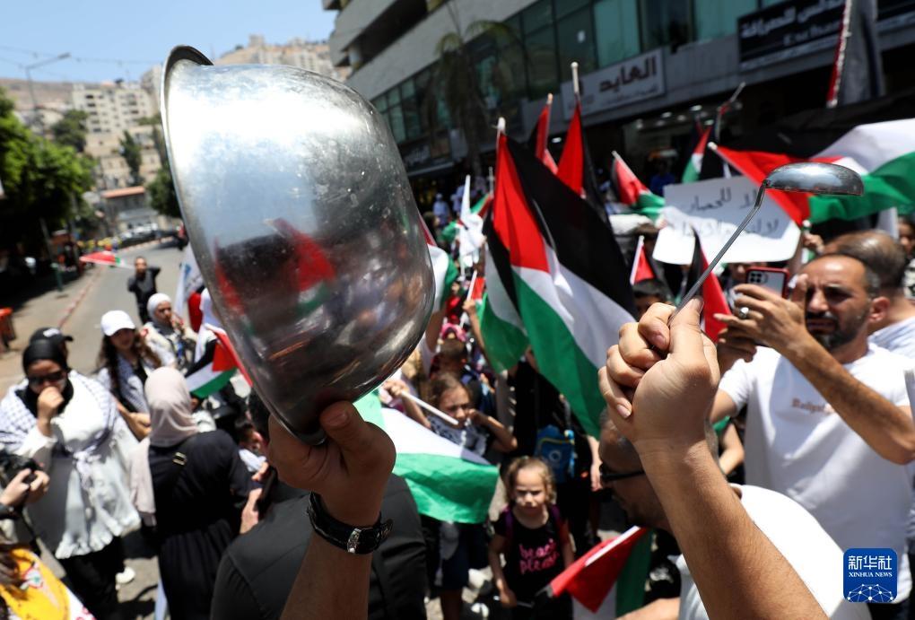 7月22日,巴勒斯坦民众在约旦河西岸城市纳布卢斯示威,抗议以色列对加沙实施的饥饿政策。