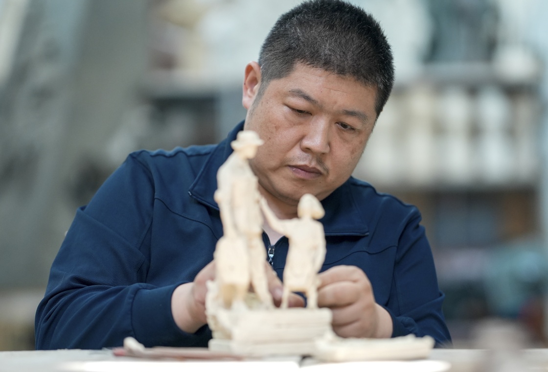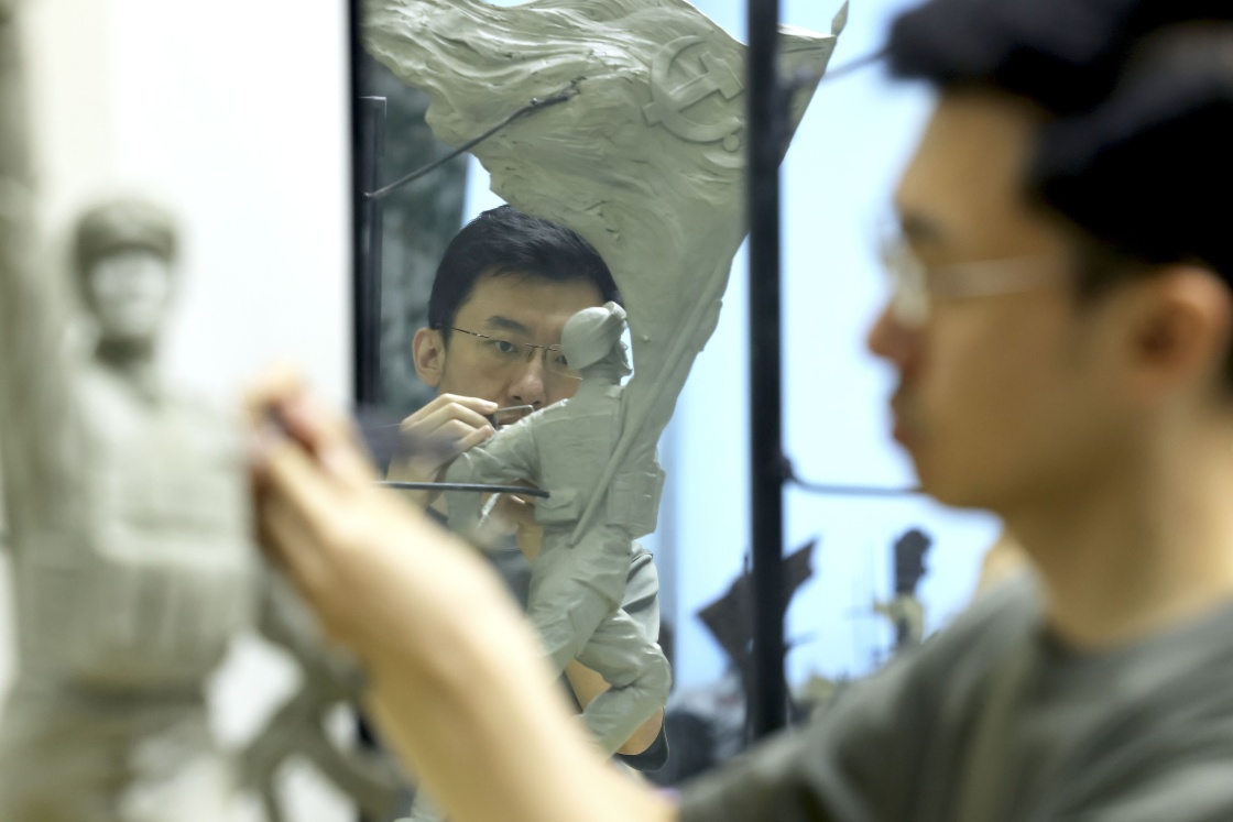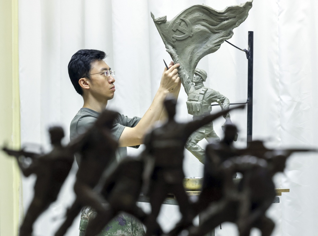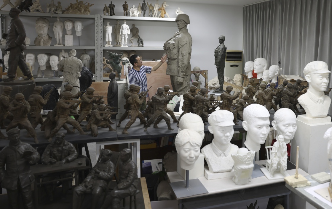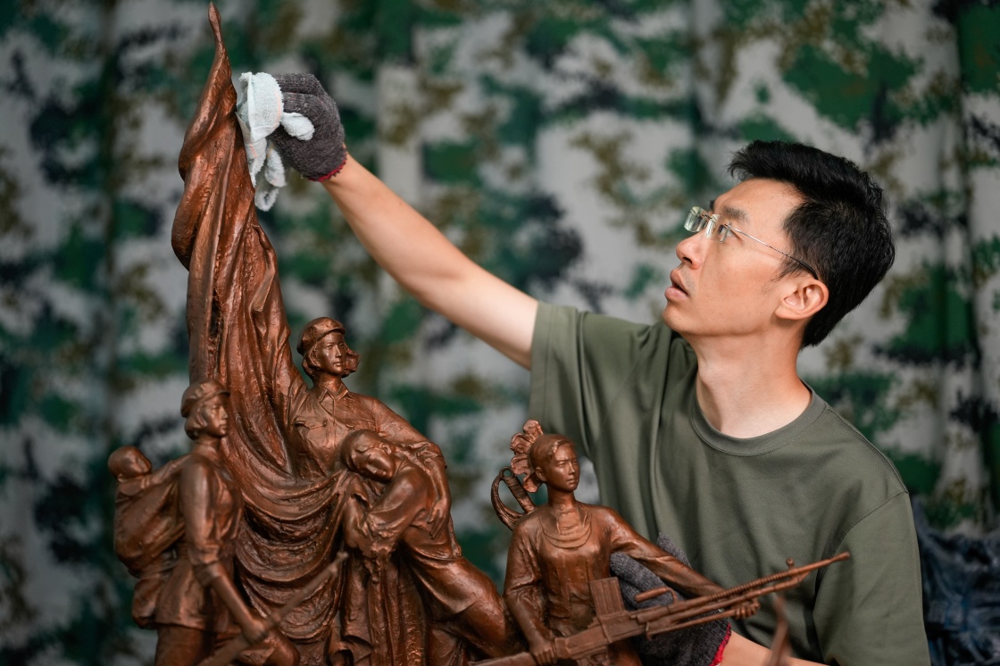 7月17日,解放军文工团雕塑创作员郎钺在擦拭雕塑。新华社记者周荻潇 摄