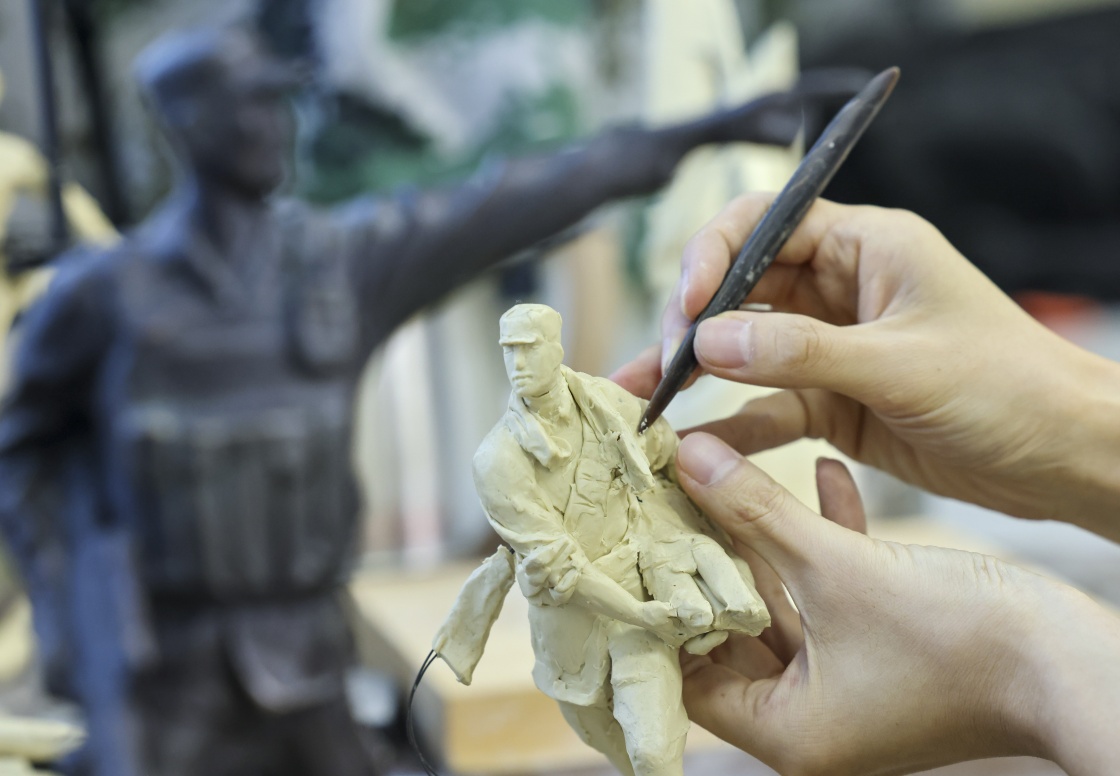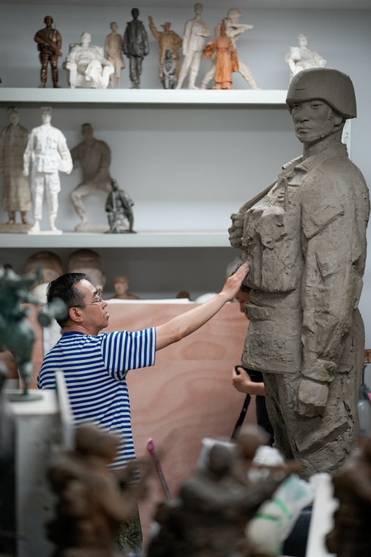 7月17日,解放军文工团雕塑创作员郎钺在进行雕塑创作。新华社记者 殷刚 摄