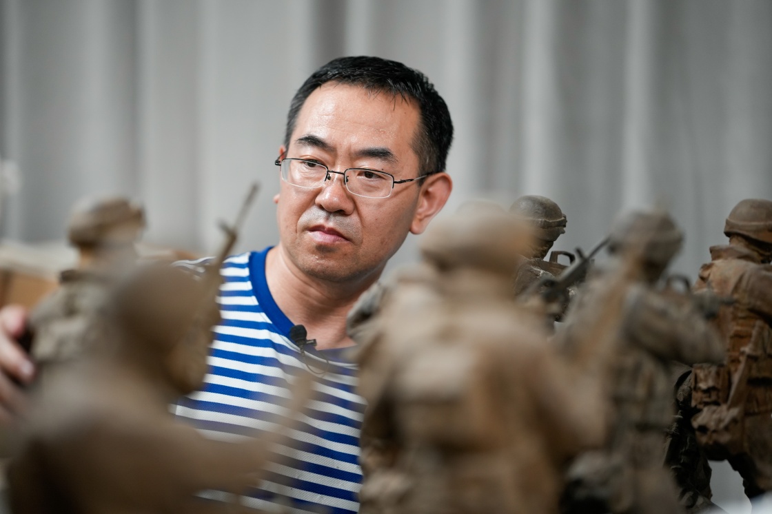 7月24日,国防大学军事文化学院副教授王树山在查看自己的雕塑作品。新华社记者 殷刚 摄