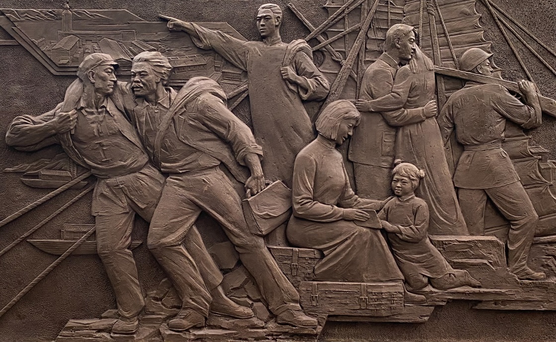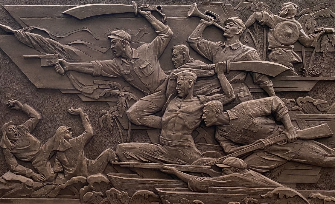 这是解放军文工团雕塑创作员郎钺创作的,以东江纵队抗战为背景的浮雕《南粤烽火 卫士先驱》。新华社发