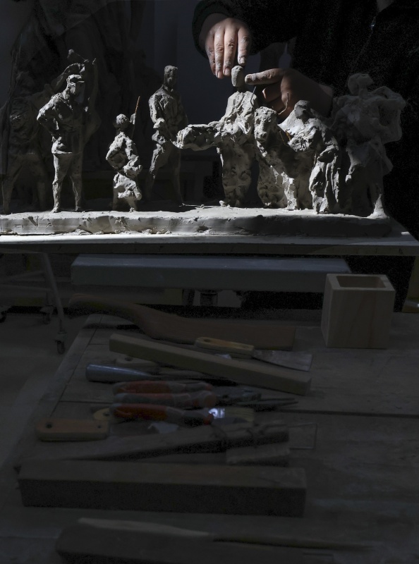 7月17日,中国人民革命军事博物馆创作员谈强在进行雕塑创作。新华社记者 殷刚 摄