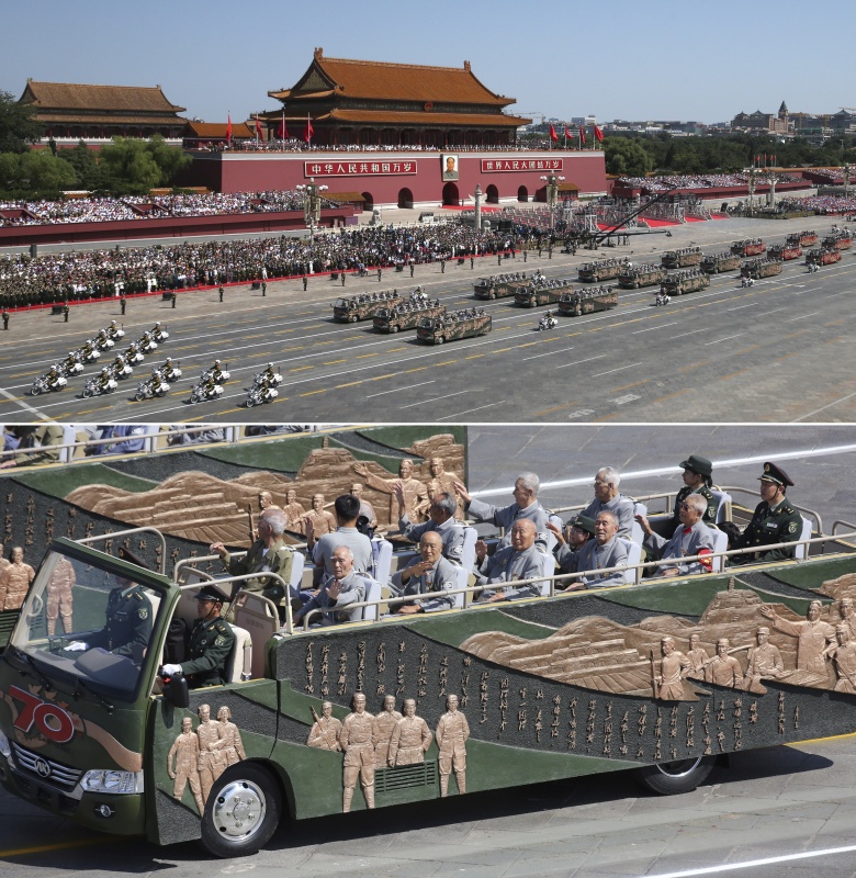 这是在中国人民抗日战争暨世界反法西斯战争胜利70周年纪念大会上拍摄的、由谈强带领中国人民革命军事博物馆团队设计制作的抗战老兵和抗战支前模范乘车方队车辆两侧的浮雕(拼版照片,2015年9月3日摄)。浮雕再现了东北抗联艰苦斗争、卢沟桥激战、百团大战、淞沪会战和中国远征军作战等中国抗战历史瞬间。新华社记者殷刚 摄