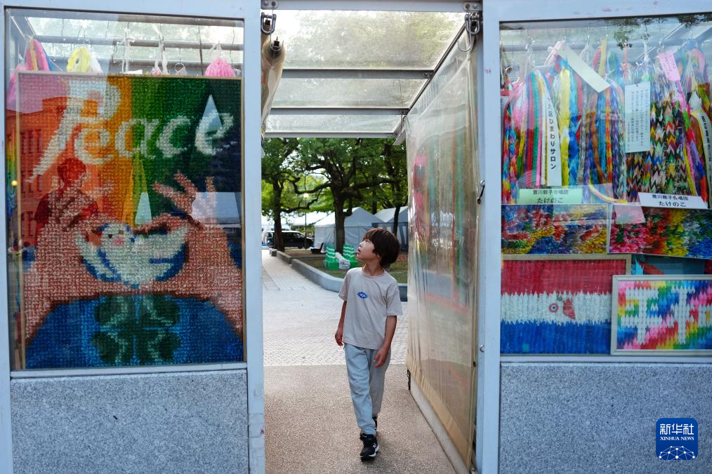 8月5日,在日本广岛和平纪念公园,一名小朋友经过展出的祈愿和平的千纸鹤叠串。
