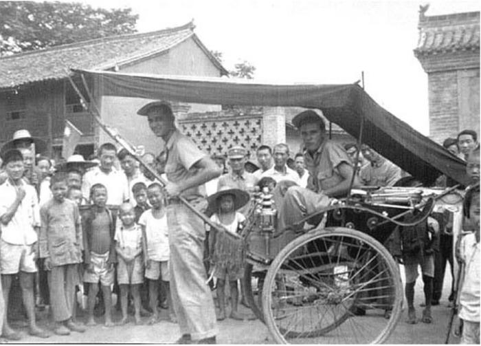 美国飞行员在汉中街头拉黄包车。(资料图)汉中市档案馆供图