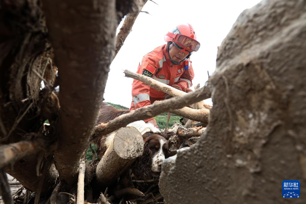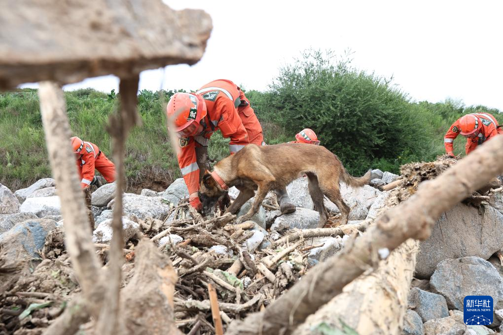 8月10日,武警甘肃总队机动支队官兵在兰州市榆中县马莲滩村搜寻失联人员。新华社发(刘亚斌 摄)