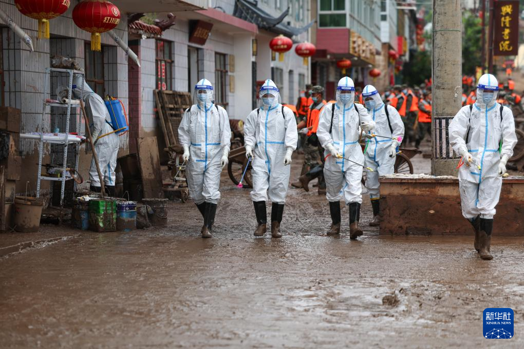 8月10日,武警甘肃总队医院卫勤分队官兵在兰州市榆中县城关镇兴隆山村受灾街道进行防疫消杀。新华社发(侯崇慧 摄)
