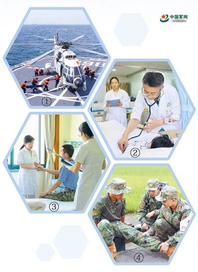 图①:海军“吉祥方舟”号医院船开展海上卫勤救护训练。图为医护人员转运“伤员”。王天摄 图②:陆军军医大学第一附属医院心血管内科医护人员正为患者检查身体。胡永波摄 图③:海军第971医院中医科医护人员正为患者诊治。季文赛摄 图④:第8个中国医师节前夕,联勤保障部队第920医院组织医疗队深入训练一线巡诊。张王璇摄