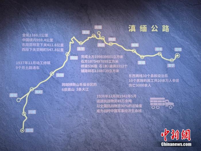 图为滇缅公路路线图,“血肉筑就抗战生命线——抗战时期滇缅公路档案文献图片展”展出内容。