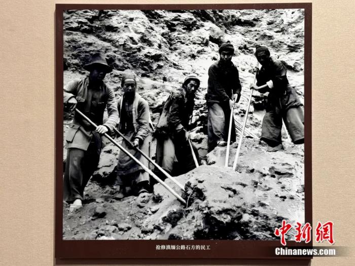 图为抢修滇缅公路石方的民工,“血肉筑就抗战生命线——抗战时期滇缅公路档案文献图片展”展出内容。