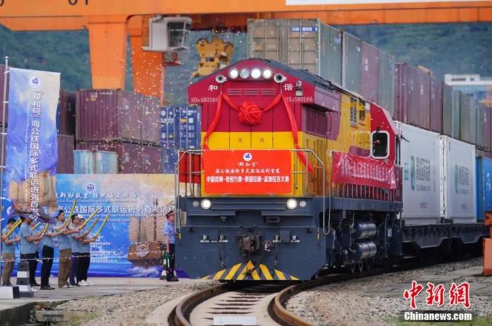 图为7月4日,“郑和号”海公铁国际多式联运班列在云南昆明首发,标志着中国西南连接印度洋的新国际物流通道贯通。中新社记者刘冉阳 摄