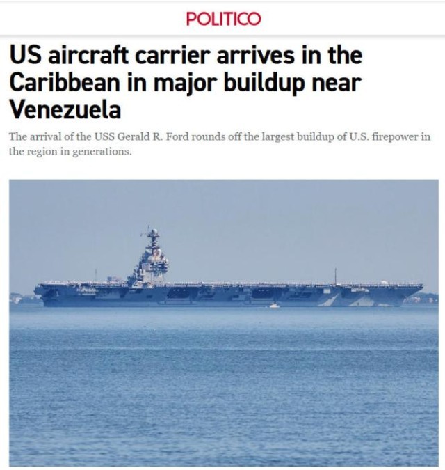 中新网11月17日电据美国政治新闻网(POLITICO)报道,当地时间16日,美国“福特”号航空母舰抵达加勒比海,并在委内瑞拉附近展开大规模军事集结。