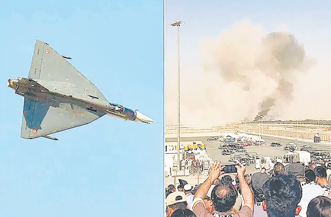 左图为“光辉”战机在迪拜航展飞行表演的画面,右图为坠机现场画面。(图源:印媒)