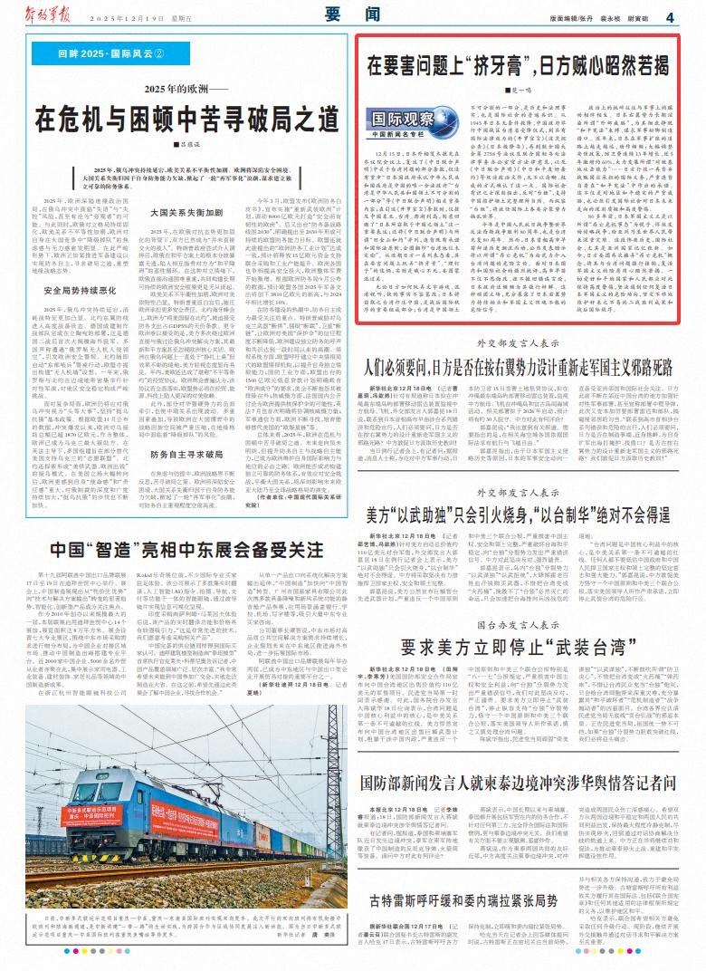 政治上的挑衅往往与军事上的躁动相伴相生。日本右翼势力长期渲染所谓“外部威胁”,为其彻底挣脱“和平宪法”束缚、谋求军事松绑制造借口。近年来,日本在军事扩张的道路上越走越远,动作频频:大幅调整安保政策,防卫费连续13年增长、近5年激增约60%,大力发展所谓“对敌基地攻击能力”……日方行径一再背弃战败国应承担的国际义务,严重违背自身在“和平宪法”中作出的承诺。这不仅是对地区和平稳定的严重威胁,也必然引发国际社会对日本未来走向的深刻质疑和高度警惕。