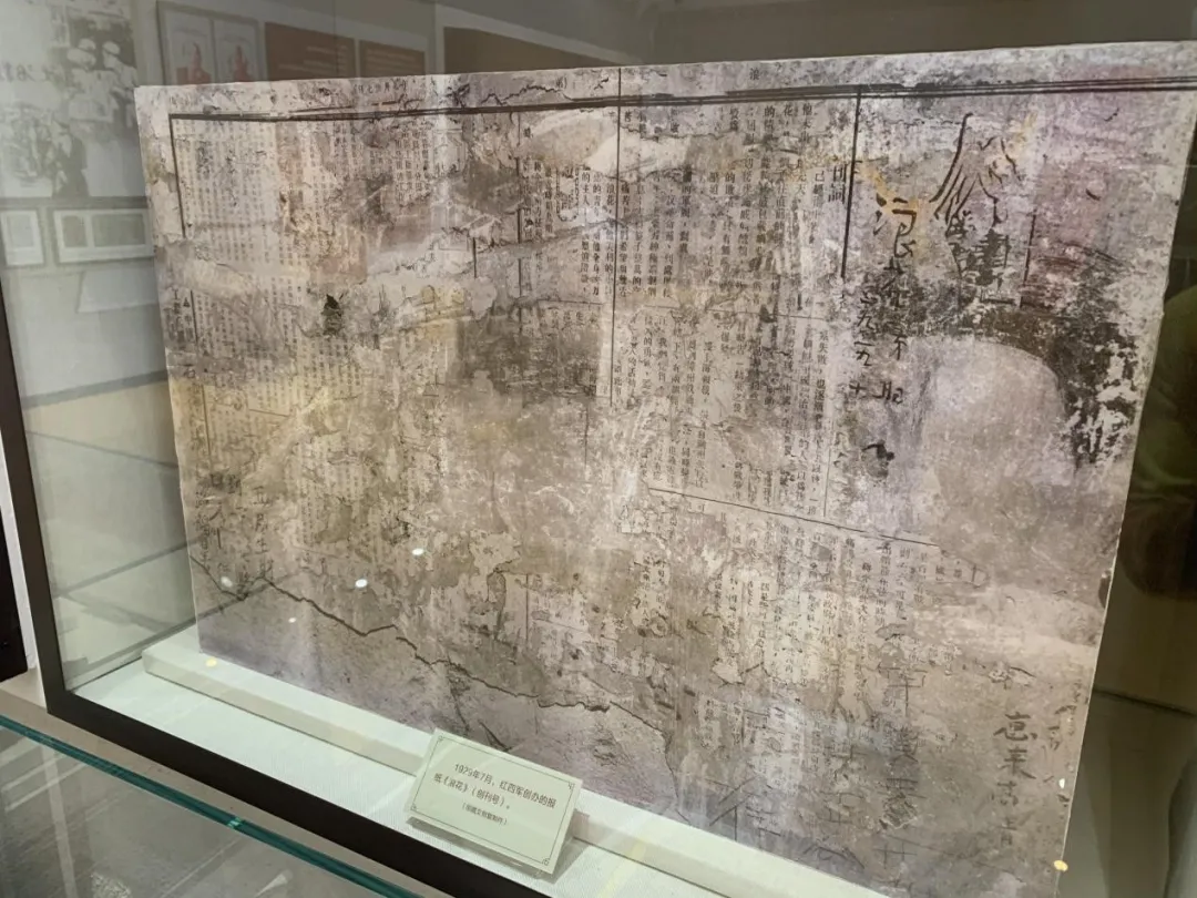在福建古田会议纪念馆中的立体玻璃展墙内,陈列着一块重达200公斤黄色土墙,土墙上坑坑洼洼,走近它才能发现,墙壁上粘连着一张长约37厘米,宽约56厘米的报纸,它的版面虽然已经破损,但是右侧仍然可以看出“浪花”“一九二九”的字样。