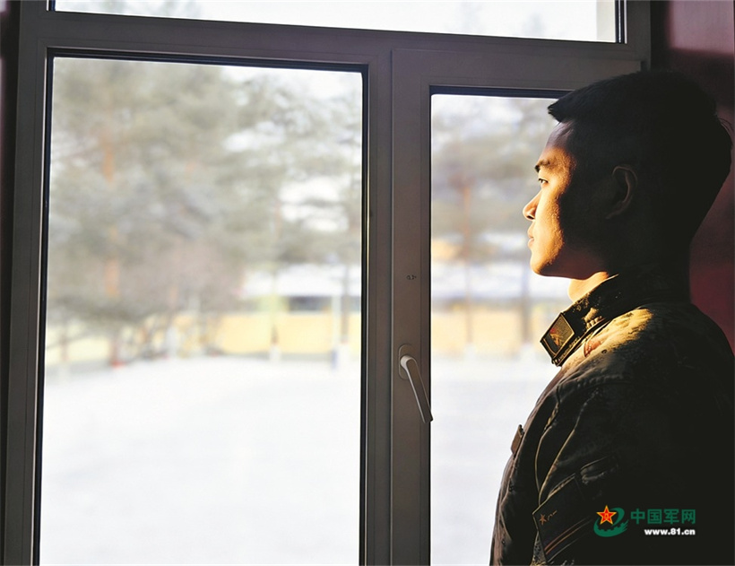 一名战士在窗前眺望雪景。马庆睿 摄