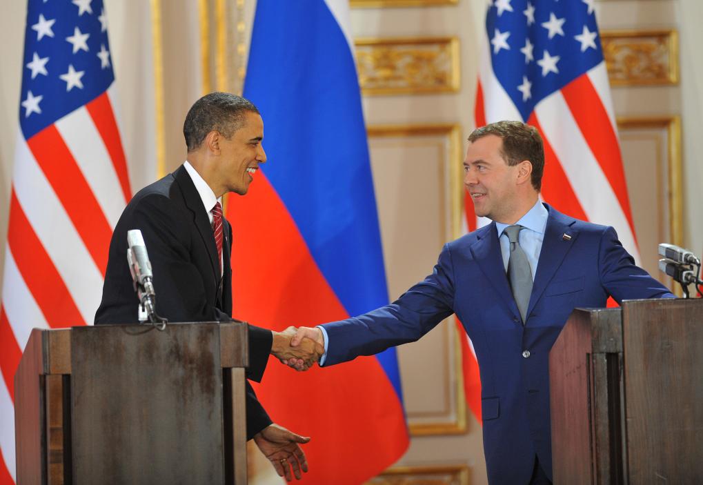 这张拍摄于2010年4月8日的资料照片显示,时任美国总统奥巴马(左)和时任俄罗斯总统梅德韦杰夫在捷克首都布拉格签署新核裁军条约后出席新闻发布会时握手。新华社记者 武巍 摄