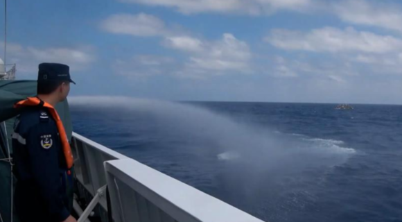 2月21日,菲律宾多艘船只集结侵闯我黄岩岛领海,被我海警万山舰编队依法驱离。这是中国海警鹤宝舰在对冲闯我黄岩岛领海的菲船只进行警示性水炮喷射(视频截图)。
