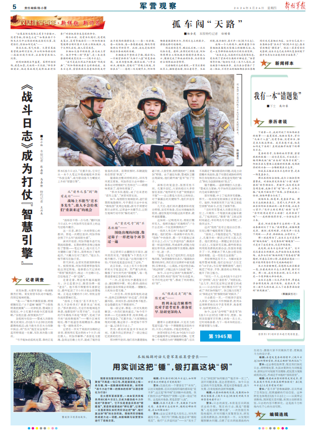 营长:“差不多”思维被破除,官兵形成了自我加压、较真碰硬的行动自觉。这种转变也体现在《战斗日志》上——从简单记录路线,到深度反思问题,再到主动探索攻坚,日志的内容不断深化。这是战斗力标准内化于心的生动写照。